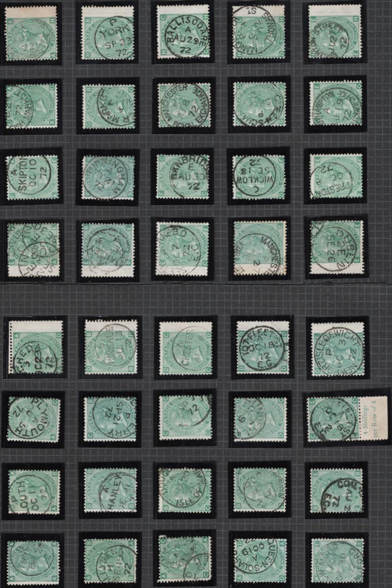 GREAT BRITAIN, 1867, 1sh GREEN WMK SPRAY ROSE PLATE 6 PLATE RECONSTRUCTION ON PAGES, #54 "A-A thru "T-L", neatly displayed, attractive group, cat. $12,600.00