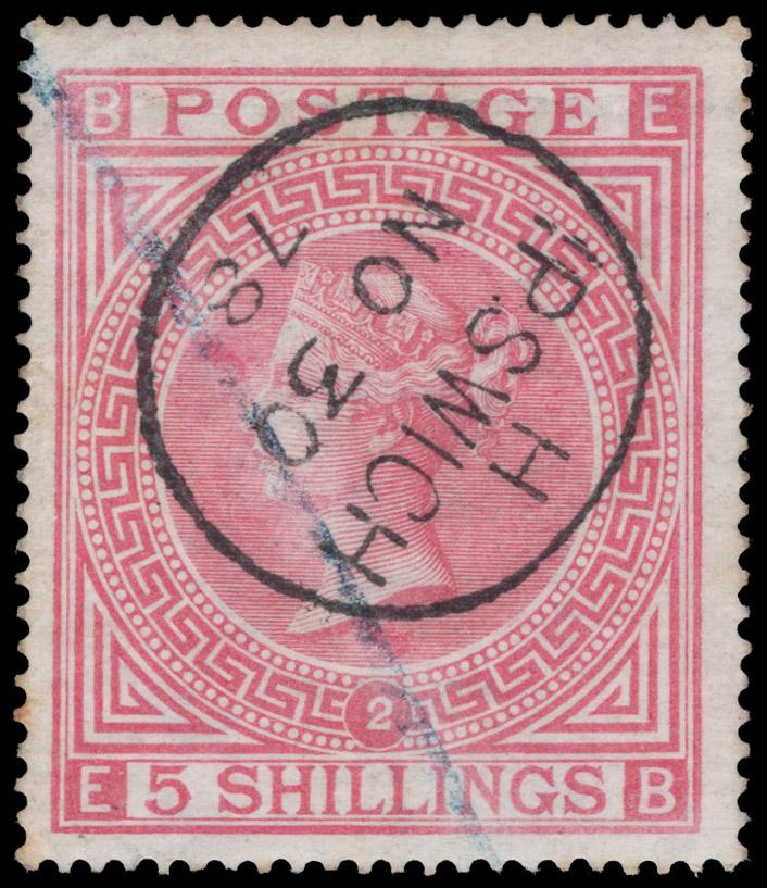 GREAT BRITAIN, 1882, 5sh ROSE WMK LARGE ANCHOR ON BLUISH PAPER USED, #90, attractive single with neatly struck London d.s., very fine, scarce in this condition, signed Pascal Scheller and with his 2025 cert., cat. $4,700.00, Gibbons #130 @ £4,000.00
