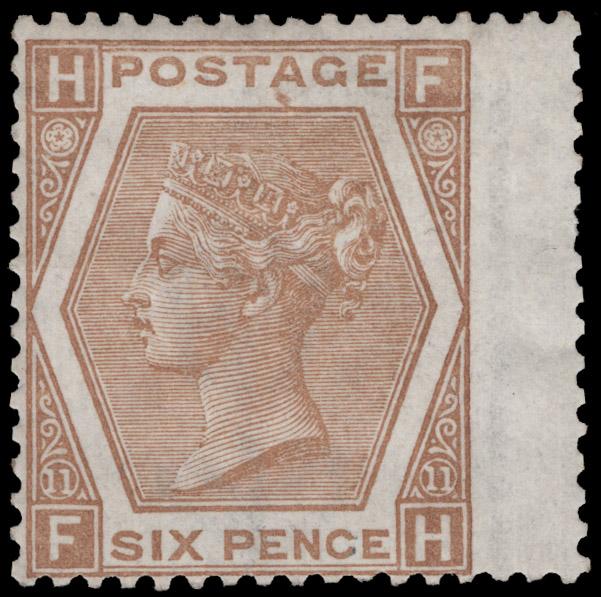GREAT BRITIAN, 1872, 6p BROWN WMK SPRAY ROSE PLATE 11 MINT, #59, "H-F", o.g. wing margin single, hinging covering about 50% of the back, fresh and fine-very fine, cat. $925.00, Gibbons #122b @ £700.00