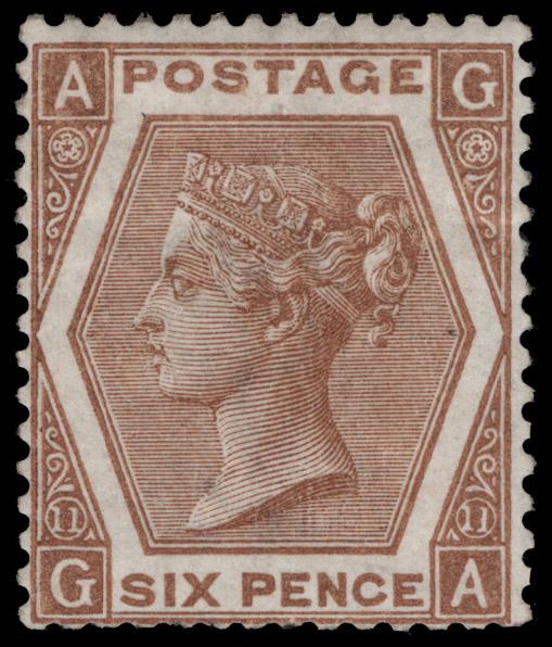 GREAT BRITAIN, 1872, 6p DEEP CHESTNUT BROWN WMK SPRAY OF ROSE PLATE 11 MINT, #59a, "A-G", fresh, o.g., previously hinged, fine-very fine, signed by Pascal Scheller, cat. $1,525.00, Gibbons #122 @ £1,300.00
