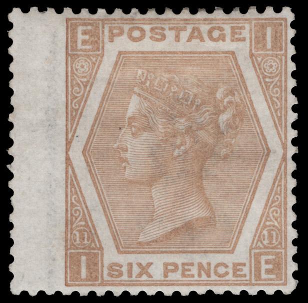 GREAT BRITAIN, 1872, 6p PALE BUFF WMK SPRAY ROSE PLATE 11 MINT, #59b, "E-I", well-centered wing margins single, o.g., h.r., very fine, cat. $1,275.00, Gibbons #123 @ £1,100.00