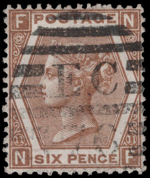 GREAT BRITAIN, 1872, 6p DEEP BROWN WMK SPRAY ROSE PLATE 11 USED, "F-N", exceptionally well-centered with perfs clearing design on all sides, perfectly sound and extremely fine, cat. $145.00+, Gibbons #122 @ £125.00