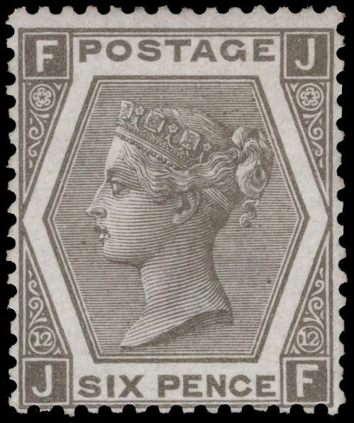 GREAT BRITAIN, 1873, 6p GRAY WMK SPRAY ROSE PLATE 12 MINT, #60, 'F-J', traces of o.g., small h.r., fresh, fine-very fine, cat. $2,200.00, Gibbons #125 @ £1,900.00
