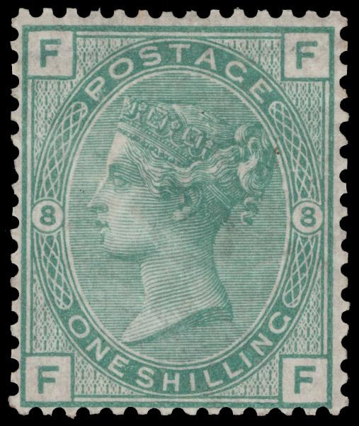 GREAT BRITAIN, 1873, 1sh DEEP GREEN WMK SPRAY OF ROSE PLATE 8 MINT, #64a, fresh, o.g., lightly hinged, very minor natuarl gum bends, fine-very fine, cat. $1,275.00, Gibbons #148 @ £1,100.00