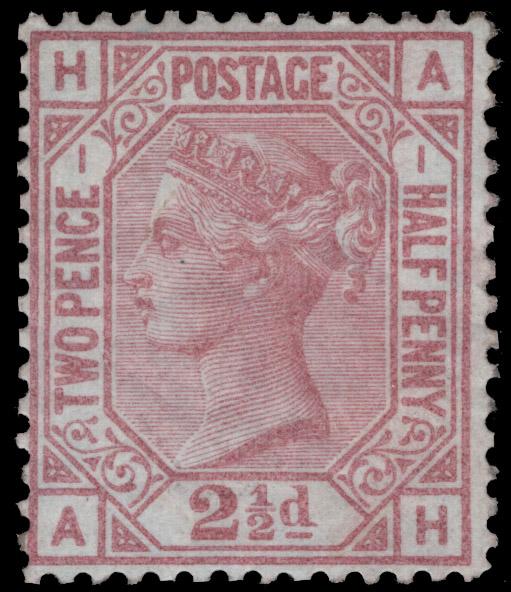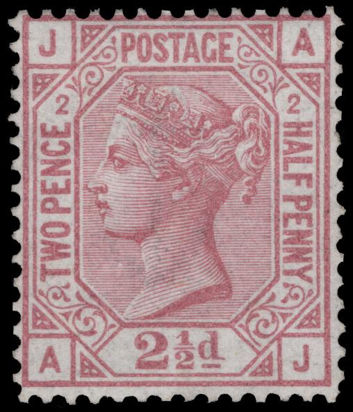 GREAT BRITAIN, 1875, 2½p CLARET WMK SMALL ANCHOR PLATE 2 UNUSED, #66, "J-A", fresh, fine-very fine, cat. $775.00, Gibbons #139 @ £675.00