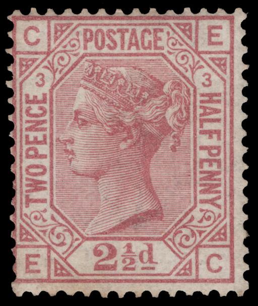 GREAT BRITAIN, 1875, 2½p CLARET WMK SMALL ANCHOR PLATE 3 MINT, #66, "C-A", fresh, o.g., lightly hinged with a faint hint gum toning in small areas, $1,175.00, Gibbons #139 @ £1,000.00