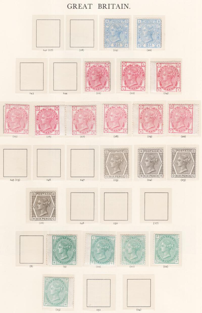 GREAT BRITIAN VICTORIA ISSUES 1975-1880 MINT ON GIBBONS PAGES, very attractive group collected by plate numbers, beautiful and fresh throughout, many issues with o.g., some unused or regummed, Gibbons numbers as listed on the pages, by Scott nos incl. 66 unused, 68 plate 19 unused, 68 pl 20 m