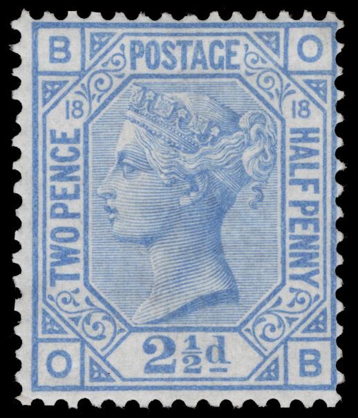 GREAT BRITAIN, 1880, 2½p ULTRAMARINE WMK ORB PLATE 18 MINT NEVER HINGED, #68, "B-O", fresh, couple light natural gum bends, fine - very fine, cat. $675.00, Gibbons #142 @ £575.00, both values as hinged