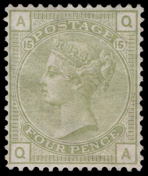 GREAT BRITAIN, 1877, 4p PALE OLIVE GREEN WMK GARTHER PLATE 15 UNUSED, #70, well-centered, regummed, very fine, cat. $1,850.00, Gibbons #153 @ £1,600.00