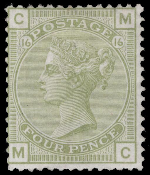 GREAT BRITAIN, 1877, 4p PALE OLIVE GREEN WMK GARTHER PLATE 16 UNUSED, #70, fresh, regummed, very faint corner crease at top right, fine-very fine, cat. $1,625.00, Gibbons #153 @ £1,400.00