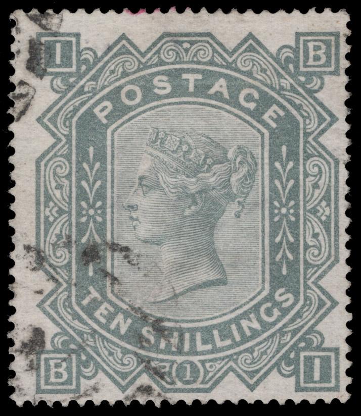 GREAT BRITAIN, 1878, 10sh GREENISH GRAY WMK MALTESE CROSS USED, #74, unobtrusive cancel, horizontal crease in top portion of stamp, fine, signed Pascal Scheller (as faulty), cat. $3,750.00, Gibbons #128 @ £3,200.00
