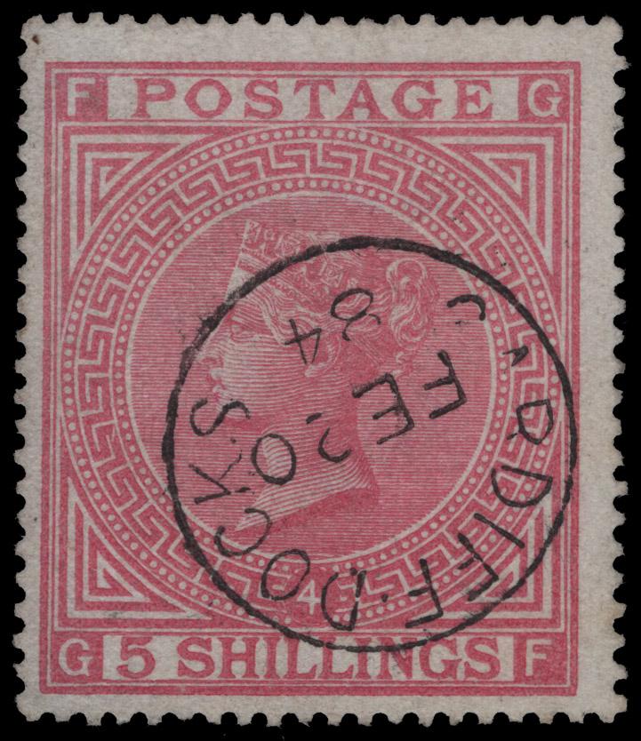 GREAT BRITAIN, 1882, 5sh ROSE WMK LARGE ANCHOR ON WHITE PAPER USED, #90a, neat Cardiff Docks d.s., fresh and very fine, signed by Pascal Scheller and his 2025 cert., cat. $4,500.00