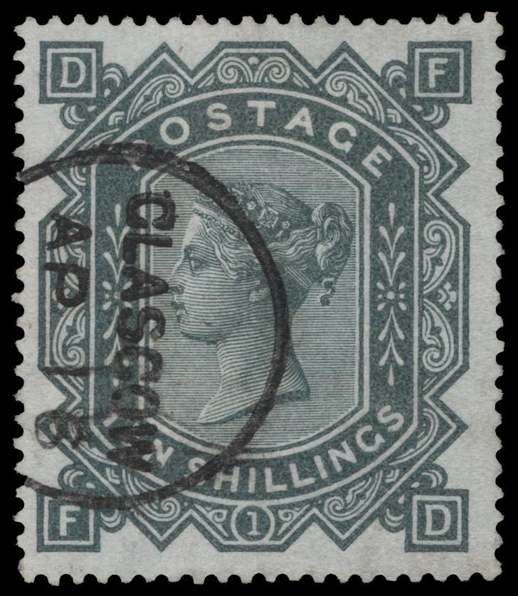 GREAT BRITAIN, 1883, 10sh SLATE WMK LARGE ANCHOR ON BLUISH USED, #91, fresh and well-centered, neat Glasgow d.s., extremely fine, signed Pascal Scheller and with his 2025 cert., rare in this condition, cat. $5,250.00, Gibbons #131 @ £4,500.00