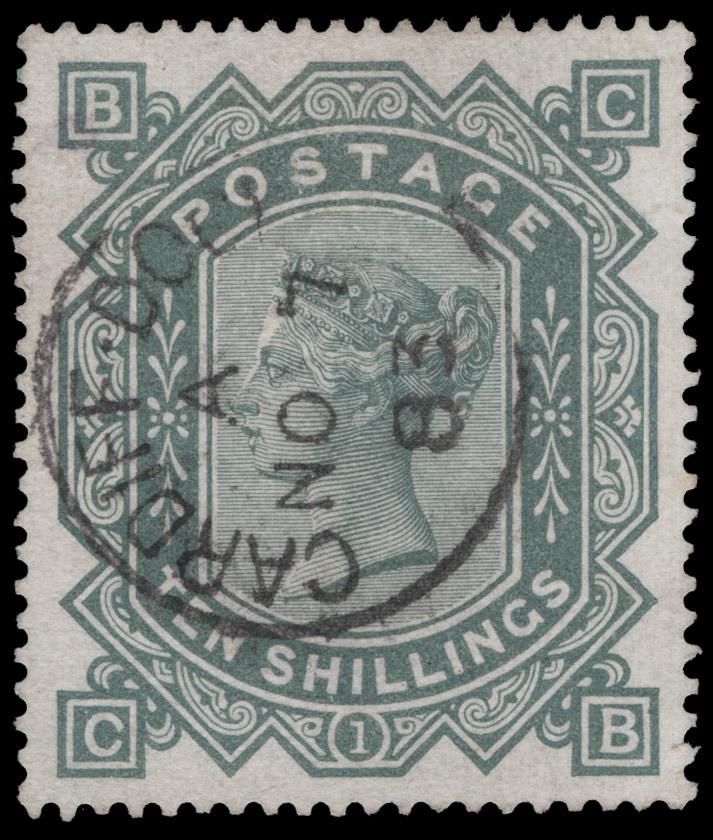 GREAT BRITAIN, 1882, 10sh SLATE WITH LARGE ANCHOR WMK ON WHITE PAPER USED, #91a, fresh and well-centered, neat Cardiff Docks d.s., choice very fine, signed by Pascal Scheller and with his 2025 cert., cat. $4,675.00