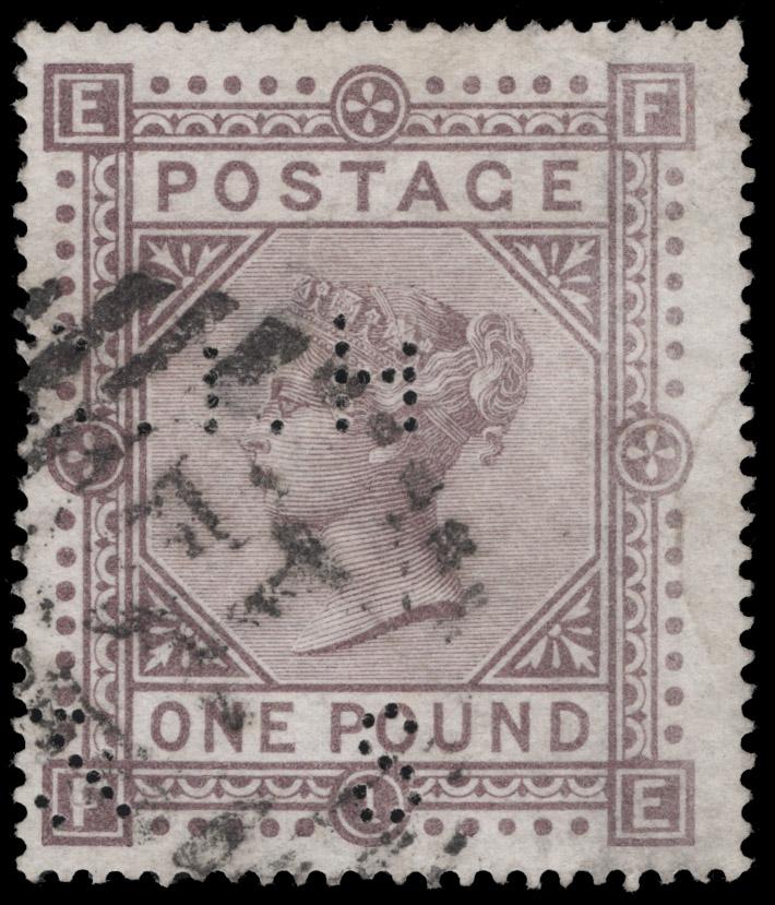 GREAT BRITAIN, 1882, £1 BROWN LILAC USED WITH PERFIN INITIALS, #92a, barred oval cancel, fine-very fine, signed Scheller, cat. $8,000.00, Gibbons #136 @ £7,000.00