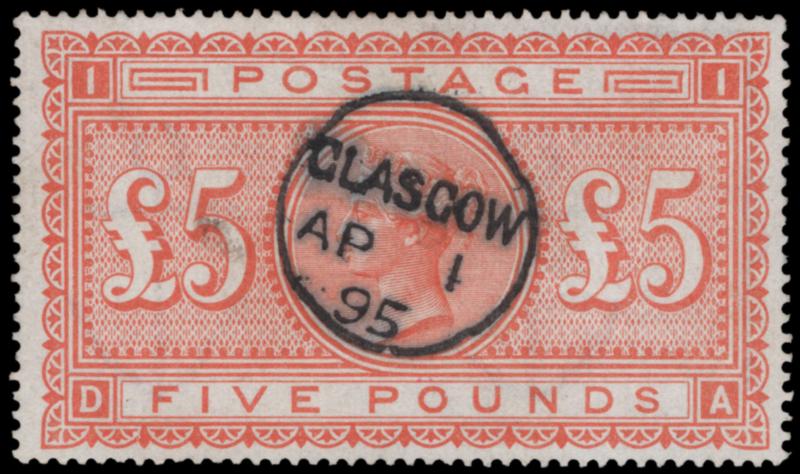 GREAT BRITAIN, 1882, £5 ORANGE USED, #93, well-centered with centrally struck Glasgow d.s., minor internal wrinkle, very fine, signed by Alberto Diena, cat. $4,100.00