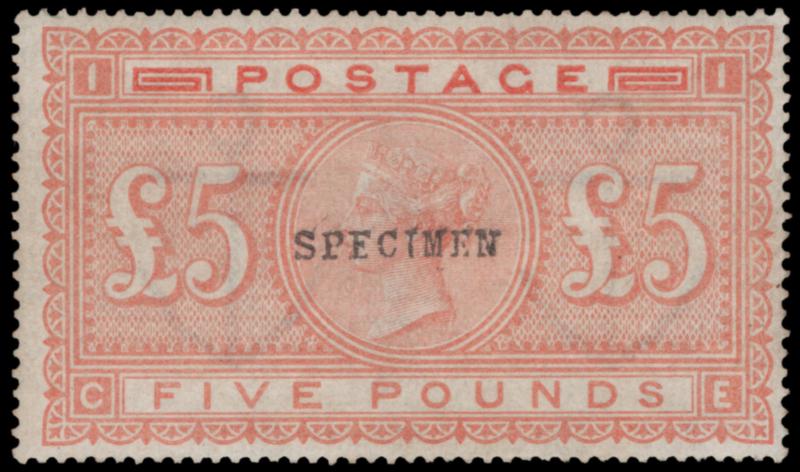GREAT BRITAIN, 1882, £5 ORANGE ON BLUISH WITH "SPECIMEN" OVERPRINT, #93bS, well-centered, regummed, hint of toning around the perfs on back, fine-very fine, scarce, cat. Gibbons #133 @ £3,000.00