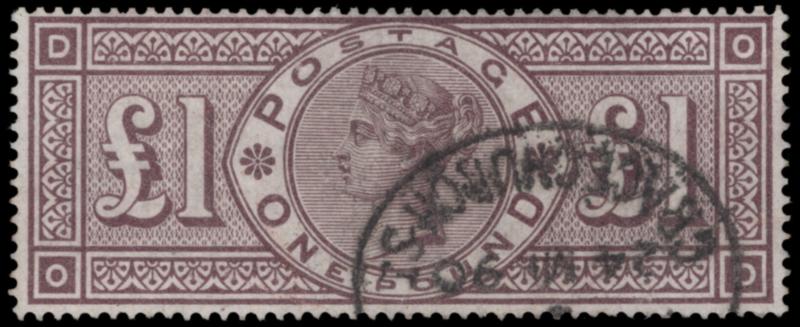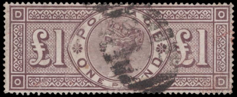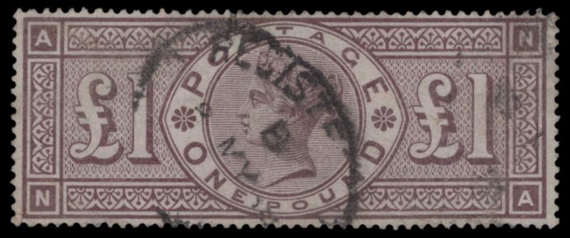 GREAT BRITAIN, 1888, £1 BROWN VIOLET WMK ORBS USED, #123, "A-N", well-centered, registration oval d.s., two small sealed tears, very fine, cat. $5,250.00, Gibbons #186 @ £4,500.00
