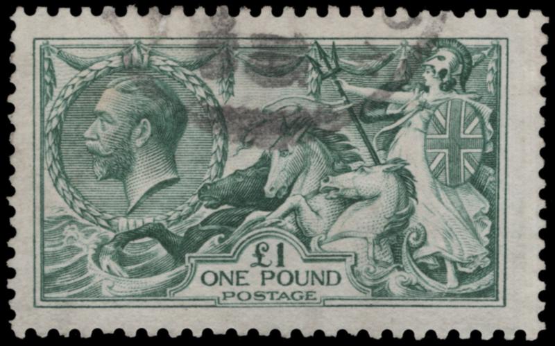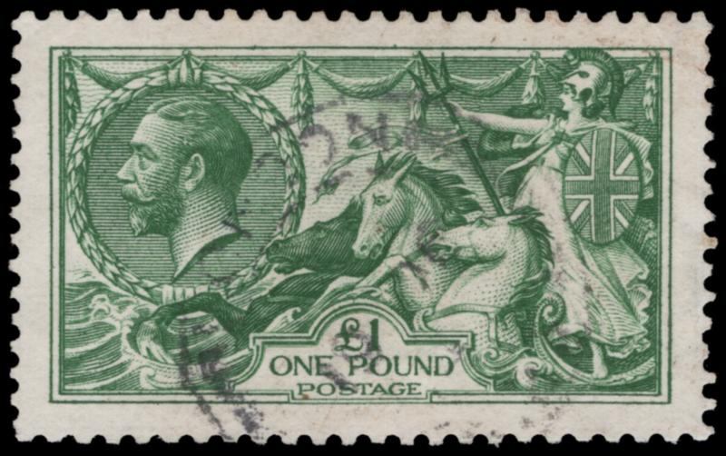 GREAT BRITAIN, 1913, £1 GREEN WATERLOW USED, #176, well-centered with a light cancel, small corner crease, reperfed at top, very fine, with 2025 Wenvoe cert., cat. $1,500.00, Gibbons #401 @ £1,400.00
