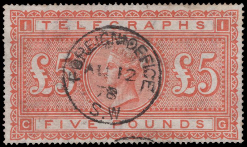 GREAT BRITAIN, 1877, £5 ORANGE TELEGRAPH STAMP USED, Gibbons #T18, well-centered with Foreign Office d.s., couple trivial short perfs, attractive sound single, very fine, cat. £3,200.00 plus 75% premium for well-centered lightly used
