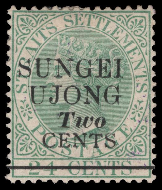 MALAYA - SUNGEI UJONG, 1891, 2c on 24c GREEN MINT, #27, o.g., h.r., fine-very fine, signed Scheller, cat. $260.00