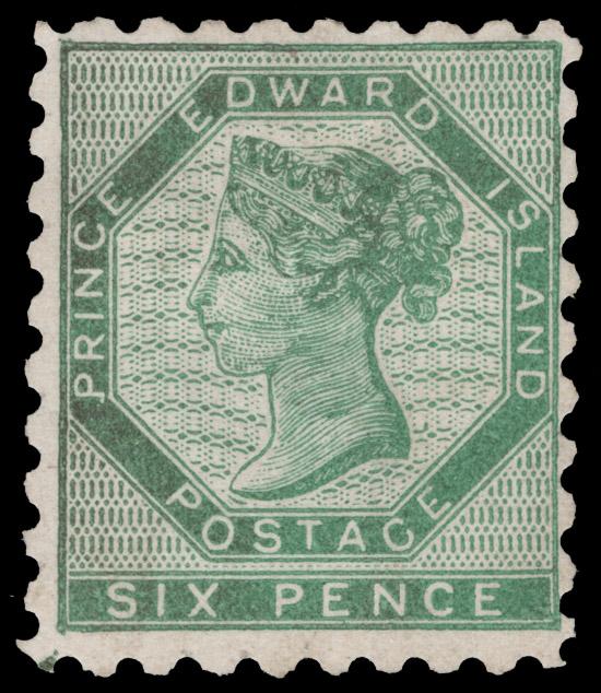 PRINCE EDWARD ISLAND, 1861, 6p YELLOW GREEN UNUSED, #3, fresh, without gum, fine-very fine, cat. $4,250.00 with gum