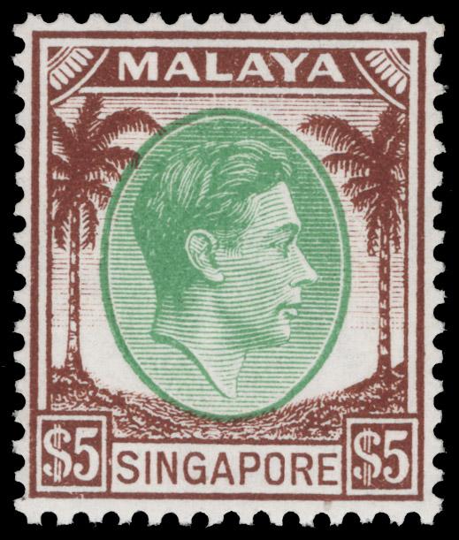 SINGAPORE, 1948, $5 CHOCOLATE & EMERALD NH, #20, well-centered, extremely fine, cat. $135.00