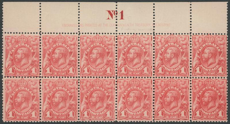 ONE PENNY: KGV 1d red SG 17 Commonwealth Treasury Imprints group comprising a block of 12 from the top of sheet with Plate 'No 1', blocks of 8 from the top of sheet with Plate 'No 2' & Plate 'No 4', Plate 1 blocks of 8 from the left & right sides of the sheet with listed varieties, and Plate 3 block of 8 from the base of the sheet ACSC 59(1)z, zb & zc, 59(2)z, 59(3)za & 59(4)z, plus blocks of 4 with complete Plate 'No 1', 'No 2', 'No 3' & 'No 4' but with incomplete imprints, most are mounted in the margins only with the stamps unmounted, a few with minor blemishes but generally very fine, Cat $2700+ for the six listed items mounted.