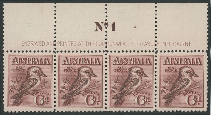 SIX PENCE: 6d Kookaburra SG 19 marginal strip of 4 from the top of sheet with complete Plate 'No 1' Commonwealth Treasury Imprint ACSC 60z, most units unusually well-centred, tiny perf-guide hole in the margin, characteristic gum bends mostly in the margin also affecting the left-hand unit, small hinge remainders in the margin only, the stamps unmounted, Cat $2750+ for a mounted block of 8 (£300+ for mounted singles). (Image1)
