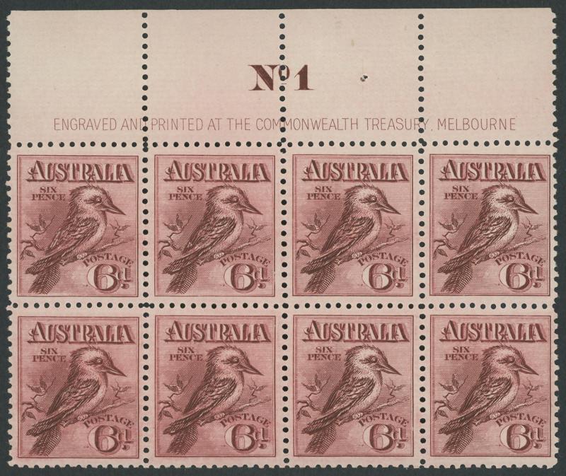 SIX PENCE: 6d Kookaburra SG 19 marginal block of 8 from the top of sheet with complete Plate 'No 1' Commonwealth Treasury Imprint ACSC 60z, unusually well-centred, tiny perf-guide hole in the margin, two lower outside units lightly mounted, the other six unmounted, Cat $2750+ for mounted (£600+ for mounted singles). (Image1)