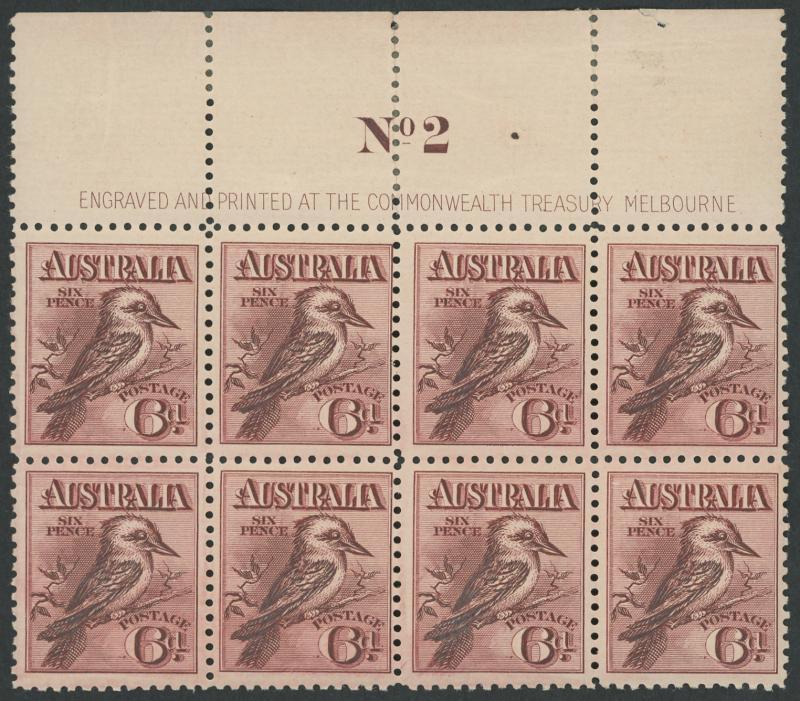 SIX PENCE: 6d Kookaburra SG 19 marginal block of 8 from the top of sheet with complete Plate 'No 2' Commonwealth Treasury Imprint ACSC 60za, most units unusually well-centred, tiny perf-guide hole in the margin, characteristic gum bends mostly in the margin which has some perf reinforcing, two lower units lightly mounted, the other six unmounted, Cat $2750+ for mounted (£600+ for mounted singles). (Image1)