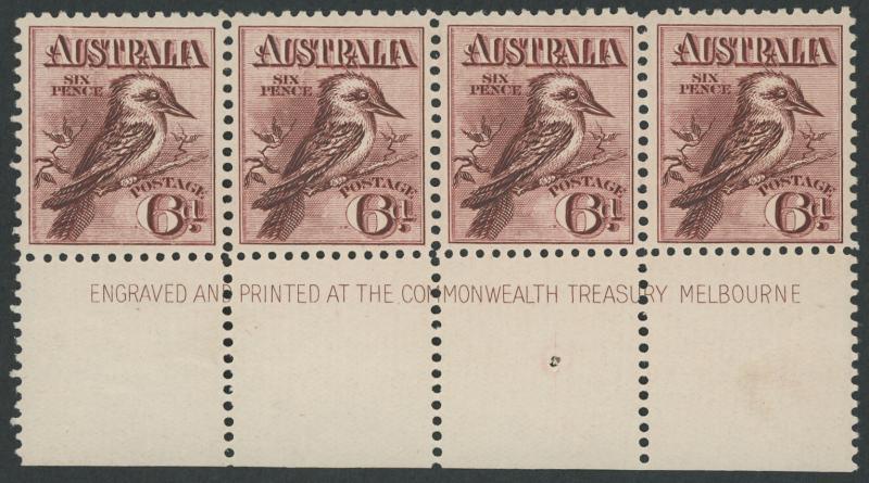 SIX PENCE: 6d Kookaburra SG 19 marginal strip of 4 from the base of sheet with complete Commonwealth Treasury Imprint ACSC 60zd, two left-hand units well-centred, tiny perf-guide hole in the margin, two outside units lightly mounted, the others unmounted, Cat $2750 for a mounted block of 8 (£300+ for mounted singles). (Image1)