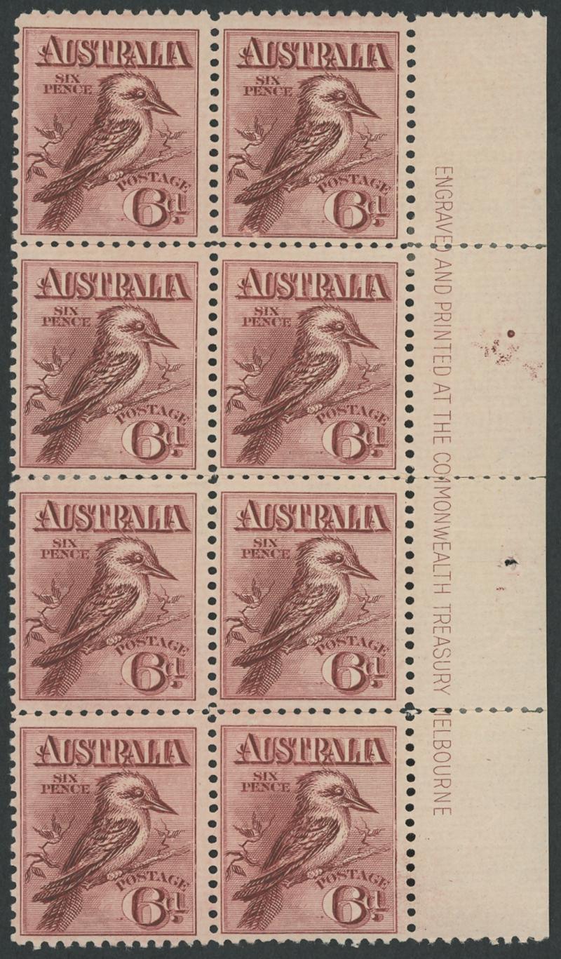 SIX PENCE: 6d Kookaburra SG 19 marginal block of 8 from the right side of sheet with complete Commonwealth Treasury Imprint ACSC 60zf, tiny perf-guide hole in the margin, some perf reinforcing in the margin, five units lightly mounted or with small hinge remainders, the others unmounted, Cat $2750+ for mounted (£600+ for mounted singles). (Image1)