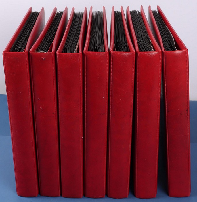 KABE 16-ring binders (7) in F-VF condition with 26 size 2 & 120 size 3 G-VGC 16-ring double sided pages. Estimated new replacement value over $700. Ideal for the serious cover/stationery collector. (Image1)