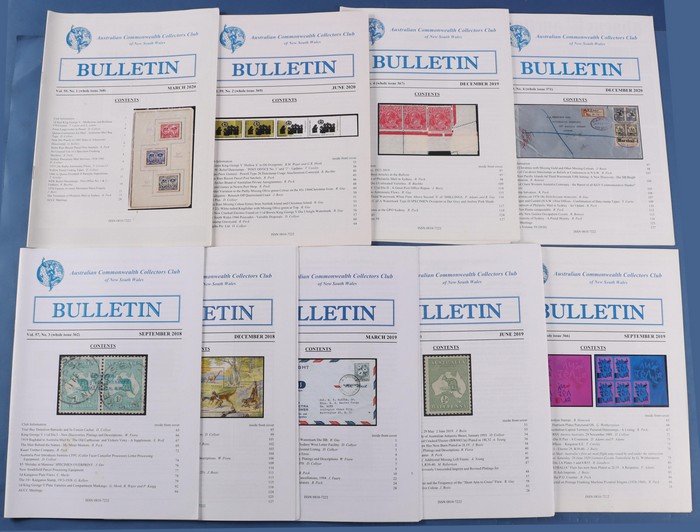 Australian Commonwealth Collectors Club (ACCC) Bulletin comp run from June 2013 to Dec 2024, plus scattered back issues (7), & Frama imprint issues (15) nos. 30-44. Also Australian Commem Hand Pmks 1905-86 by Sorge. (67 items) (Image1)