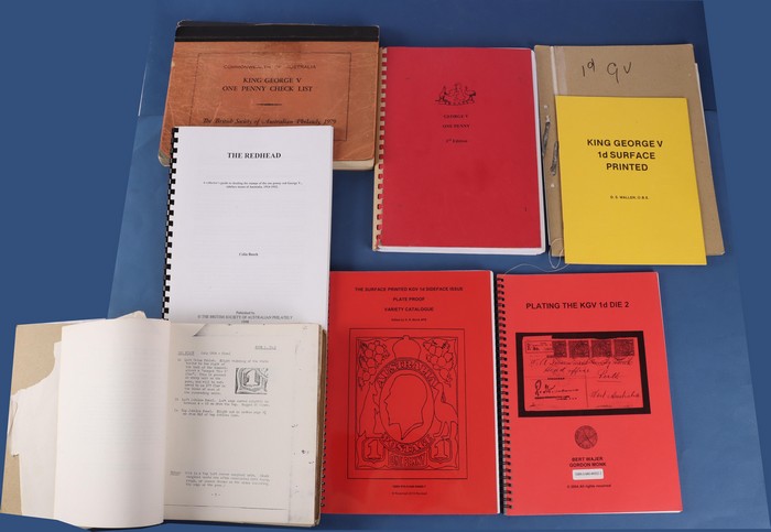 Australia KGV 1d reference book collection inc BSAP 1d Plate Flaws, 1d Plate Proof Flaws, Die II Plating, The Redhead - C Beech, few others. Essential references for the 1d red KGV collector. Some obvious usage, 1d Red Checklist, much used, damaged spine. Overall generally nice condition. Retail $250+. (8) (Image1)
