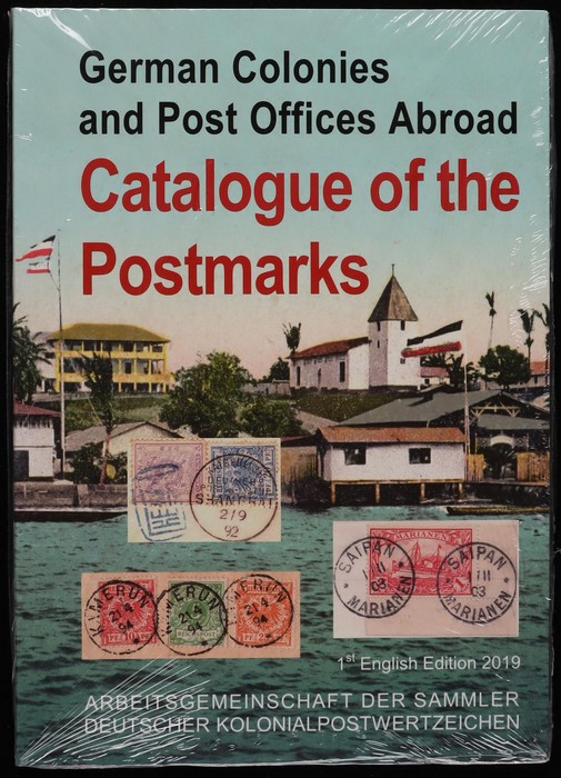 German Colonies & POs Abroad postmark Catalogue, 1st English edition 2019, 235 pgs with valuation on piece or cover inc POs in China, Field Post during Boxer Rebellion, South Seas (Pacific) Seapost, Navy Ship Mail & all the colonies. Illustrated throughout. Essential reference. New. Retail $100+. (Image1)