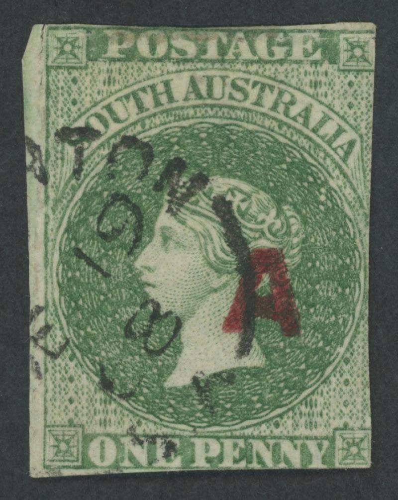 RED OVERPRINT: 'A ' (No Stop after 'A '; as always on the 1d) on QV Perkins Bacon Large Star Wmk Rouletted 1d yellow-green SG DO1 with roulettes at top & left but cut from the sheet on all sides to largely preserve the design, light '[GAMBIE]RTON/DE19/68/SA' cds, Cat £400. Rated RRR: Ron Butler rates unused examples at RRRR but Don Pearce has identified no examples & believes that none have been recorded. Ex 'Sir Humphrey': sold for $490 (Sale 118 Lot 119). The similar-quality 'Tamiami' example sold for $719 (Sale 236 Lot 538). Don Pearce's very fine example sold for $570 (Sale 247 Lot 6). [Date range 19.9.1868 to 19.12.1868 only]