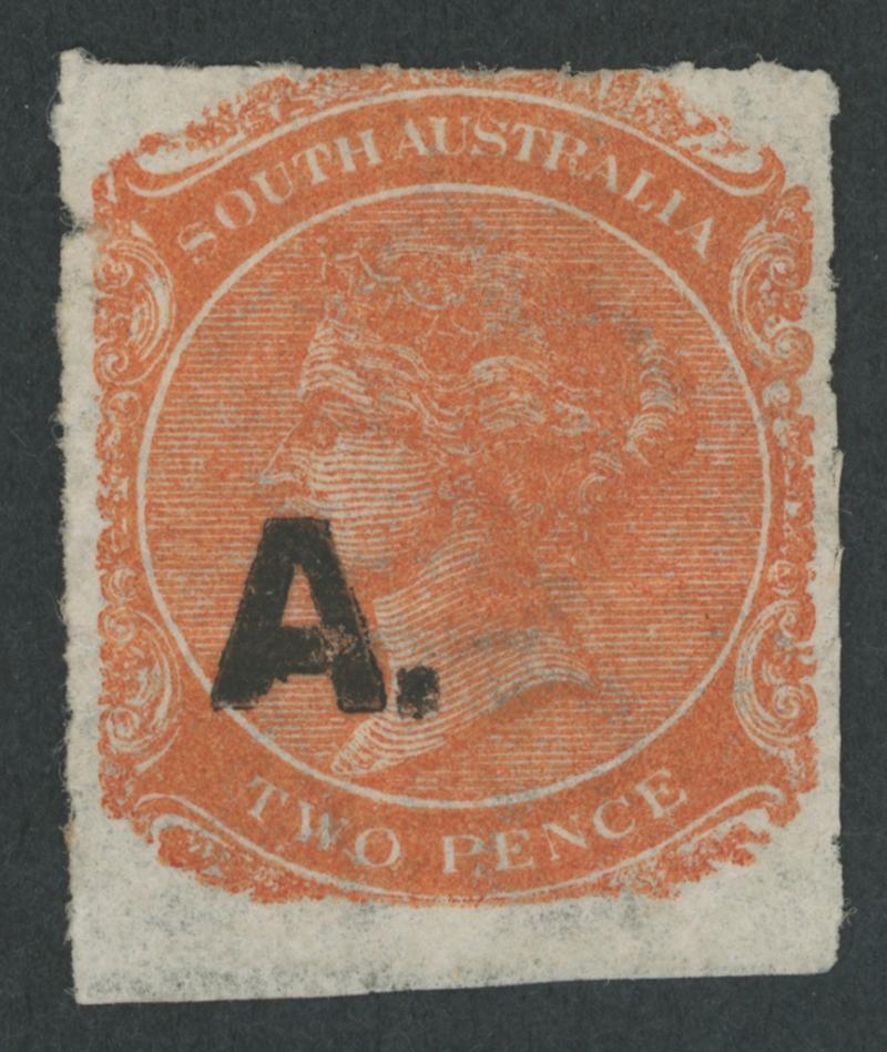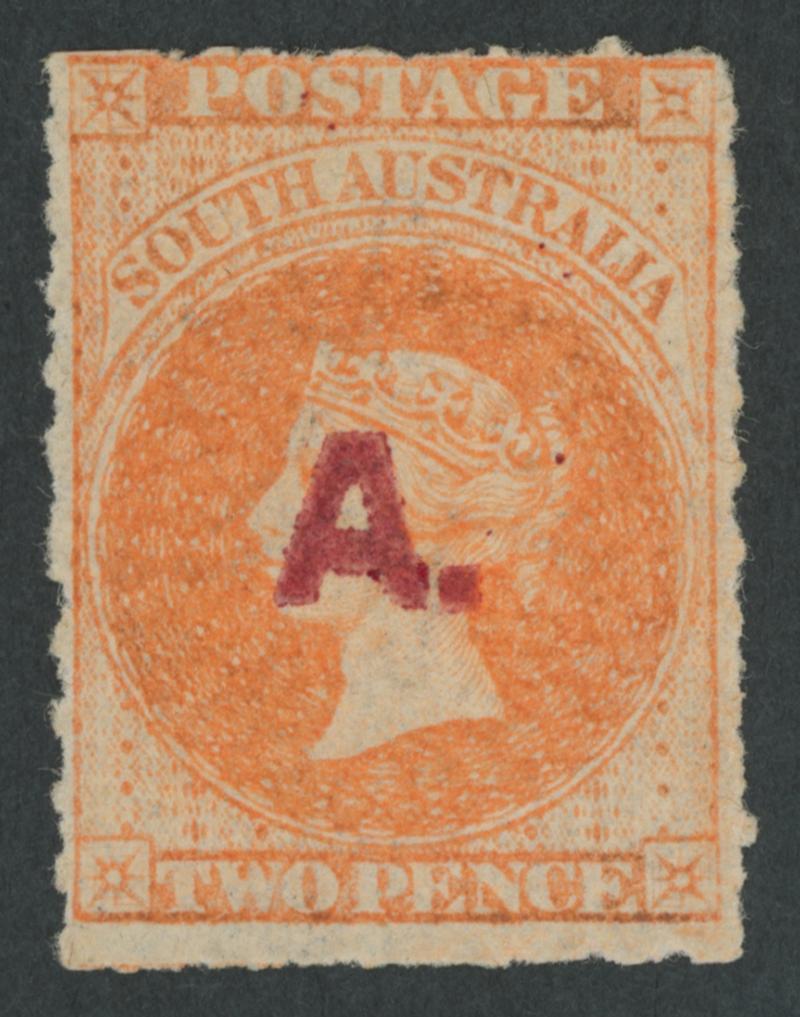 BLACK OVERPRINT: 'A.' on QV De La Rue Crown/SA Wmk Rouletted 2d deep orange SG DO6 with the Watermark Reversed, rouletting on all sides, light ironed-out horizontal crease, unused, Cat £850. Rated RRRRR. Ex Baron von Ferrary, Theodore Champion and Philip Croker. Chris Ceremuga Certificate (2009) states "extremely rare". Absent from the 'Besancon' and Don Pearce collections. (Image1)
