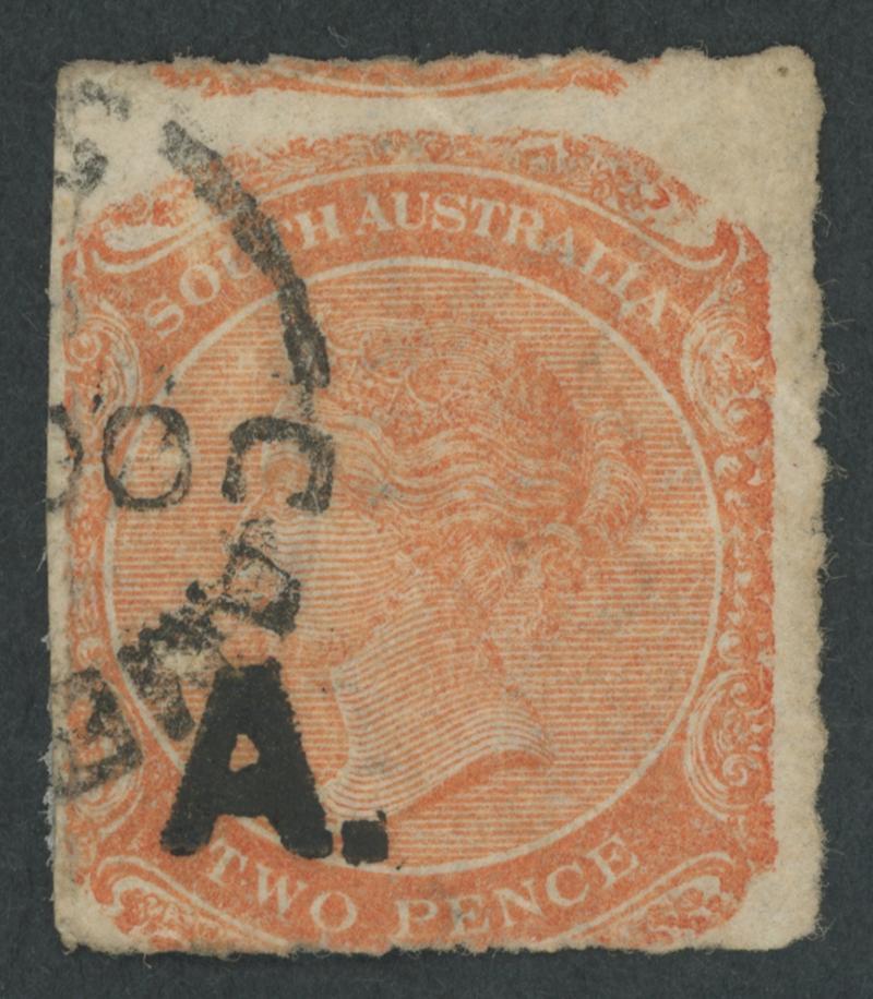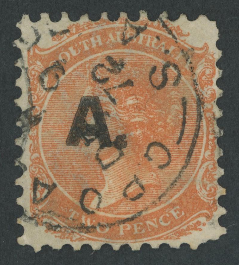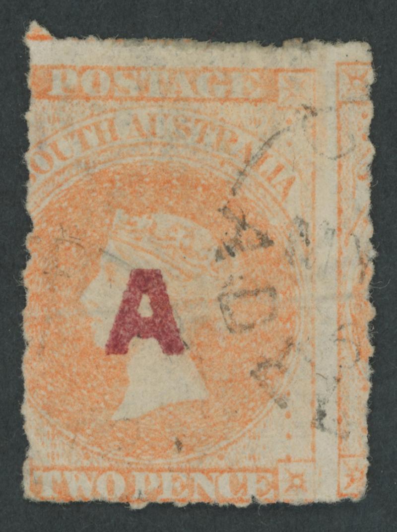 BLACK OVERPRINT: 'A.' on QV De La Rue Crown/SA Wmk Perf 10 2d deep orange SG DO10, one pulled perf at lower-right, GPO cds of DE9/72. Rated RRR; not recorded unused. Ex Don Pearce: sold for $1015 (Sale 247 Lot 14). [Date range 27.4.1872 to 9.12.1873] (Image1)