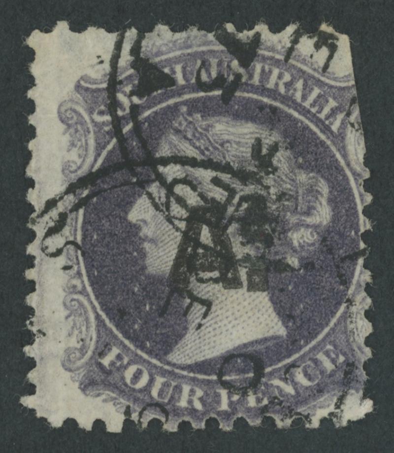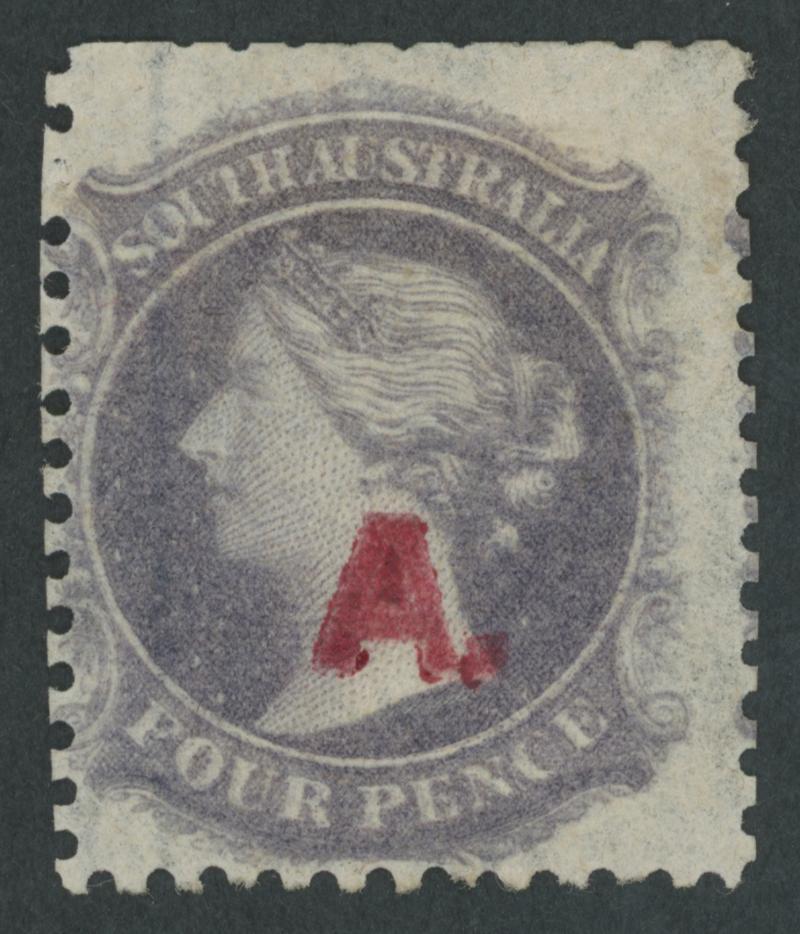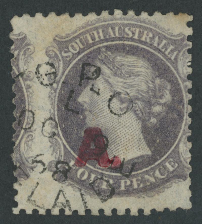RED OVERPRINT: 'A.' with Stop on QV Perkins Bacon Large Star Wmk Perf 11½-12½ 4d dull purple SG DO5, huge example with part of the adjoining unit at left, a couple of faint tonespots, very fine 'GPO/OC9/68/ ADELAIDE' cds, Cat £1250. Ex Don Pearce: sold for $1255 (Sale 247 Lot 10). Rated RRRRR: the earlier of only two recorded examples. [Date range 9.10.1868 to 15.4.1871, indicating a miniscule rate of usage] (Image1)