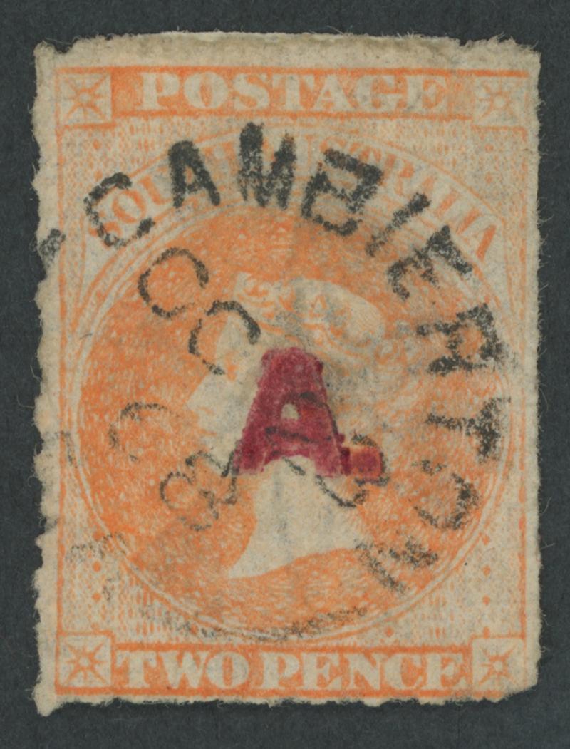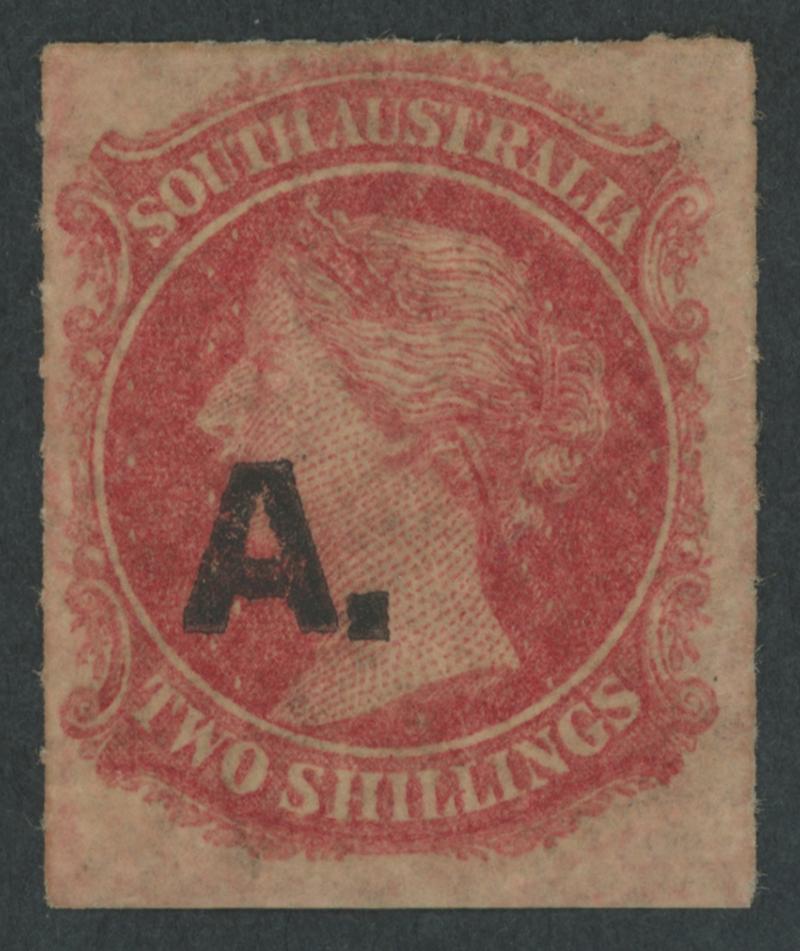 RED OVERPRINT: 'A.' on QV Perkins Bacon Large Star Wmk Rouletted 2d bright vermilion SG DO2 with roulettes on all sides, shallow thins, 'GAMBIERTON/OC28/68/SA' cds, Cat £300. Rated RRRR. Chris Ceremuga Certificate (2019). Don Pearce's fine example sold for $527 (Sale 247 Lot 8). [Date range 1.6.1868 to 21.12.1868] (Image1)