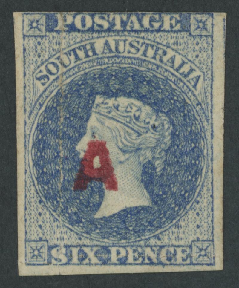 RED OVERPRINT: 'A ' (No Stop after 'A ') on QV Perkins Bacon Large Star Wmk Rouletted 6d ultramarine SG DO3a with Misplaced Offset of the 'A' Overprint on the reverse, misplaced rouletting so cut from the sheet to preserve the design, unused, Cat £500. Rated RRR. Don Pearce's superb mint example sold for $1435 (Sale 247 Lot 11). (Image1)
