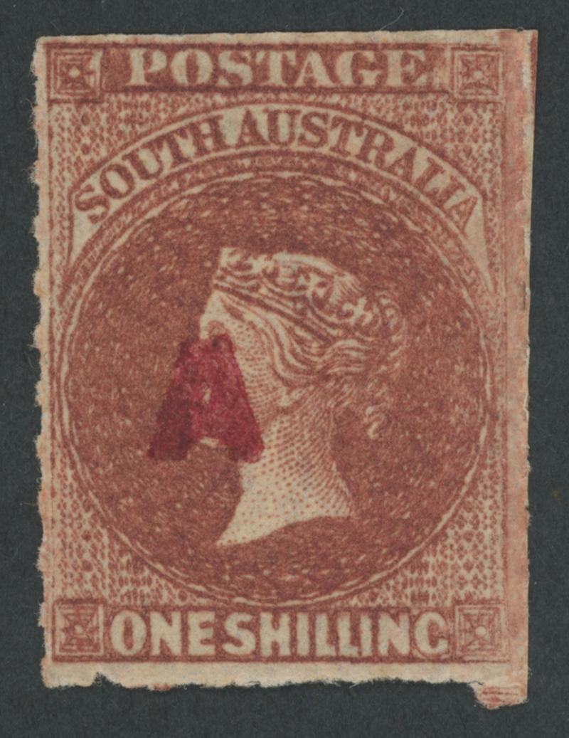 RED OVERPRINT: 'A.' with Stop on QV Perkins Bacon Large Star Wmk Rouletted 1/- red-brown SG DO4, rouletting on three sides & cut from the sheet at top well clear of the design, rounded corner at lower-right, unused, unpriced by Gibbons. Rated RRRR. Ex Baron von Ferrary, Theodore Champion and Philip Croker. Chris Ceremuga Certificate (2009) states "extremely rare". Absent from the 'Besancon' and Don Pearce collections. (Image1)