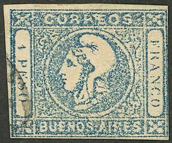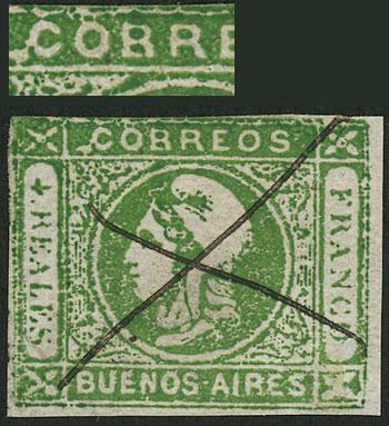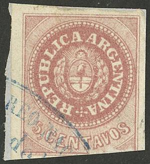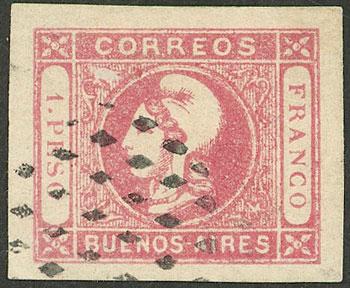 GJ.19, 1P. dull rose, clear impression, with dotted cancel of Buenos Aires, JUMBO margins, small thin on back, very scarce example (Image)