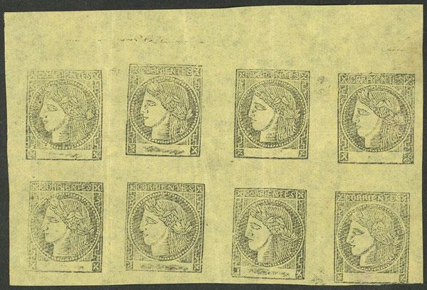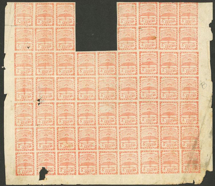 GJ.1, 5c. small figures, large block of 59 stamps, including 5 strips with the 9 types (catalog value US$60), with defects, low start (Image)