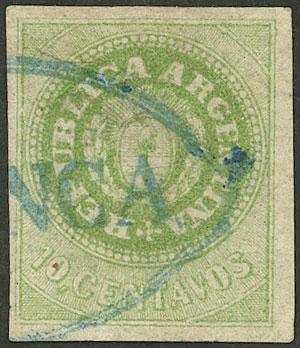 GJ.8, 10c. with accent, yellow-green, with "FRANCA" cancel of Santa Fe in blue, small defects, very fine appearance (Image)