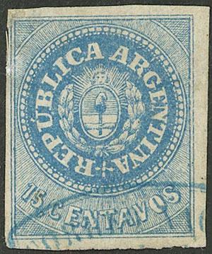 GJ.9, 15c. with accent, blue, used in Rosario, repaired, good opportunity (Image)