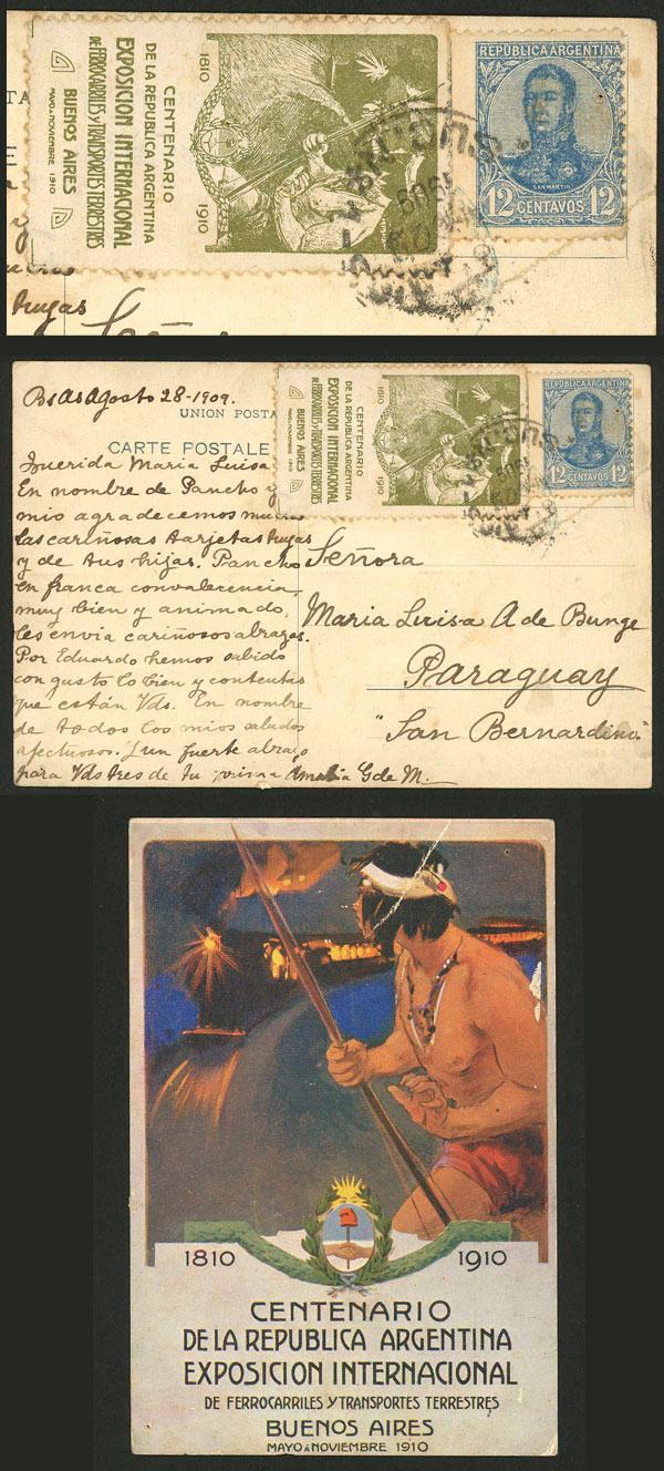 Cinderella of the Intl. Exposition of Railways and Land Transport, on a postcard of the same exposition franked with 12c. San Martin in oval, sent to Paraguay on 28/AU/1909, rare! (Image)
