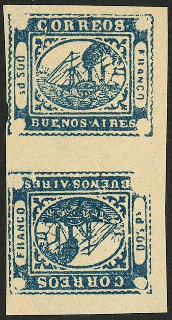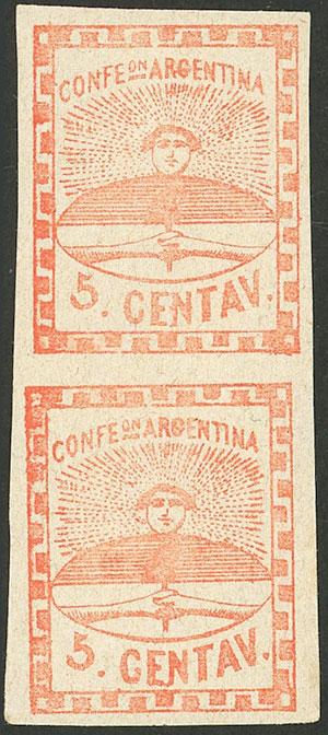 GJ.1, 5c. small figures, vertical pair, type III + I (the transposition of the 7th row can be observed, where a type I was replaced with a type III), VF quality (Image)